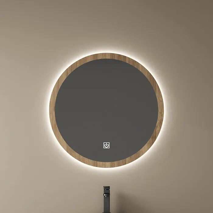 - Modern appearance: these wholesale wall mounted cabinets bathroom design features a wall-mounted, double-layer main cabinet installed in a suspended manner to minimize cleaning blind spots and enhance the bathroom’s cleanliness. The circular glass mirror, designed in such a refined and stylish shape, gives a nice clear reflection. The white countertop basin, minimalistic and clean, adds a hint of freshness to the bathroom, nicely combining with the overall style of the bathroom.