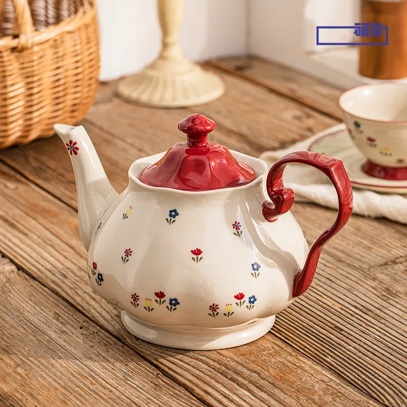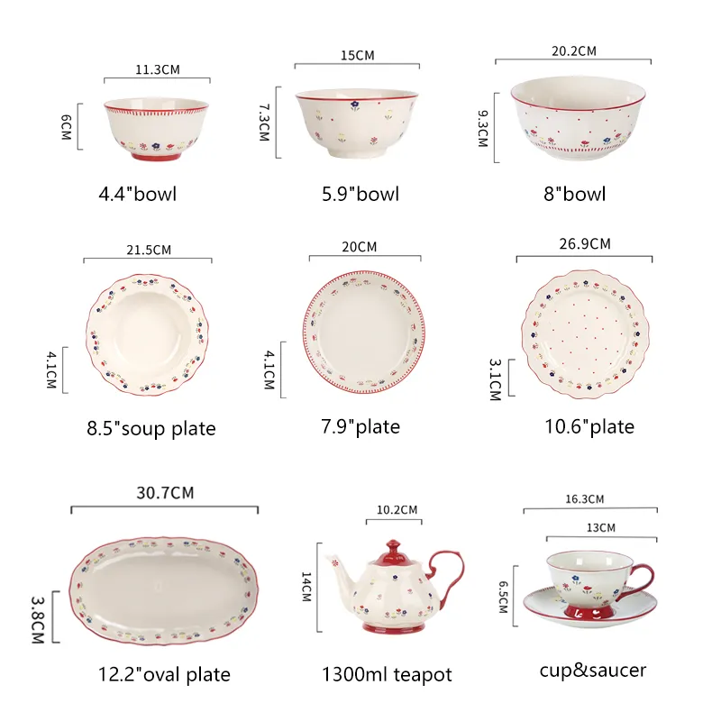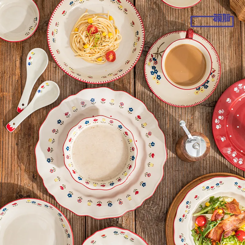 温かみのあるレトロなデザイン: この卸売り食器セットは、オフホワイトの背景と赤の組み合わせで、花柄は新鮮で柔らかく、様々なテーブルスタイルに適しています。